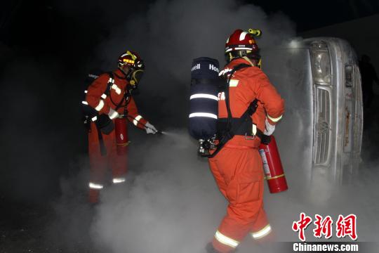 图为演练中,事故车辆着火危及追尾车辆。赵朗摄