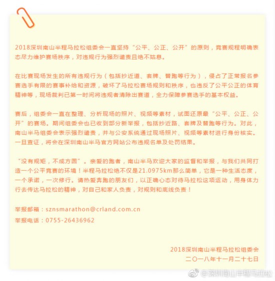 新京报讯 据深圳南山半程马拉松赛官方微博消息,2018深圳南山半程马拉松赛结束后,组委会收到一些关于比赛期间违规行为的报告,对此,我们深感遗憾。马拉松赛不止是一场奔跑,更是人生的修行;每位选手都应对自己的行为负责, 对体育精神和赛事制度负责。今日,组委会特发声明,将严查一切违规行为,绝不姑息 !