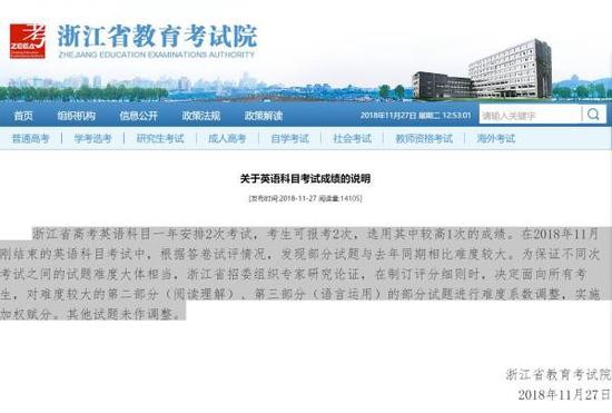 11月27日上午,浙江省教育考试院在其官方网站中发布了《关于英语科目考试成绩的说明》(以下简称《说明》),称在11月刚结束的英语科目考试中,根据答卷试评情况,发现部分试题与去年同期相比难度较大。为保证不同次考试之间的试题难度大体相当,在制订评分细则时,决定面向所有考生,对难度较大的第二部分(阅读理解)、第三部分(语言运用)的部分试题进行难度系数调整,实施加权赋分。其他试题未作调整。
