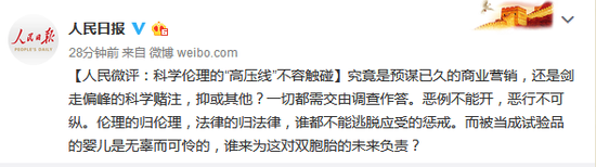 @人民日报11月27日消息,【人民微评:科学伦理的“高压线”不容触碰】究竟是预谋已久的商业营销,还是剑走偏峰的科学赌注,抑或其他?一切都需交由调查作答。恶例不能开,恶行不可纵。伦理的归伦理,法律的归法律,谁都不能逃脱应受的惩戒。而被当成试验品的婴儿是无辜而可怜的,谁来为这对双胞胎的未来负责?
