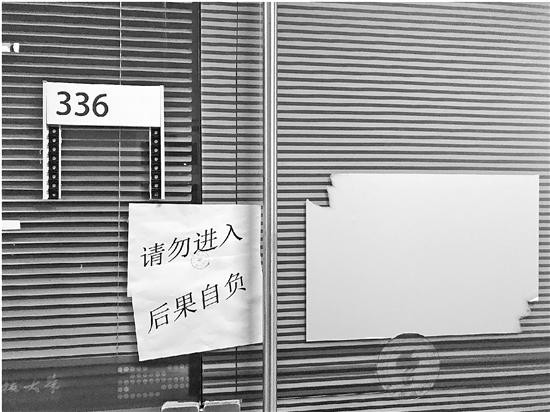 记者来到南科大第二科研楼贺建奎之前所在的生物系的办公室,他的办公室在336。昨天有媒体探访时,他的办公室门口还贴着瀚海基因(贺建奎系瀚海基因的法定代表人)相关技术被Nature子刊报道的海报,办公室窗口还挂着贺建奎的名牌。不过,27日的情况完全变了,办公室已经被封,门口张贴的宣传海报不见了,贺建奎的名牌也没了踪影,取而代之的是用两张A4纸拼贴而成的“请勿进入 后果自负”,拼贴处盖着“南方科技大学生物系”的公章。