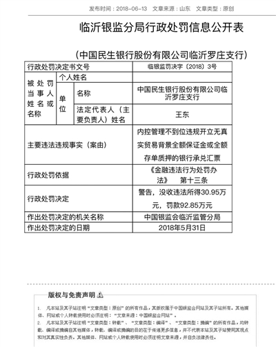 中国银行监督管理委员会官网显示,徐某案发后,中国银监会临沂监管分局对中国民生银行股份有限公司临沂罗庄支行开出行政处罚决定书(临银监罚决字〔2018〕3号)。处罚的违法事项是“内控管理不到位违规开立无真实贸易背景全额保证金或全额存单质押的银行承兑汇票”。