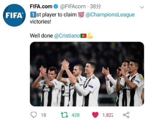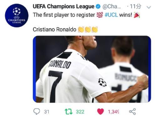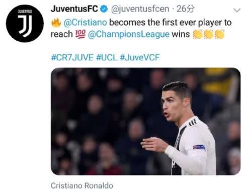 腾讯体育11月28日讯 今天凌晨的欧冠第五轮比赛中,C罗贡献了一个助攻,帮助尤文图斯击败了瓦伦西亚,斑马军也提前一轮小组出线。这场胜利也是C罗在欧冠赛场上的第100场胜利,他也成为欧冠改制以来第一位赢得欧冠百胜(曼联26场、皇马71场,尤文3场)的球员。赛后,尤文官推、欧冠官推以及FIFA官推都对C罗表达了祝贺,而意大利媒体《都灵体育报》以及《罗马体育报》也开始怒赞C罗。