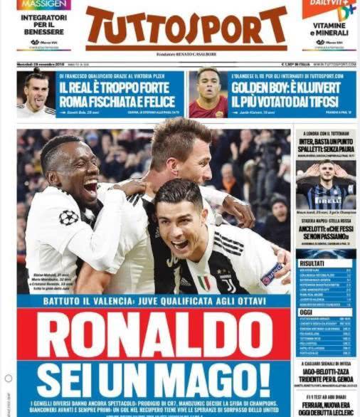 其中《都灵体育报》头版写道:“罗纳尔多,你真是一位魔术师!尤文晋级,梦幻组合的演出——罗纳尔多惊人的盘带、曼朱打进关键一球。”而《罗马体育报》则这样写道:“我闪光的朋友。尤文晋级,曼朱-C罗的组合是决定性的。罗纳尔多(100场欧冠胜利)没有得分,但为克罗地亚人送上了精彩的助攻。”