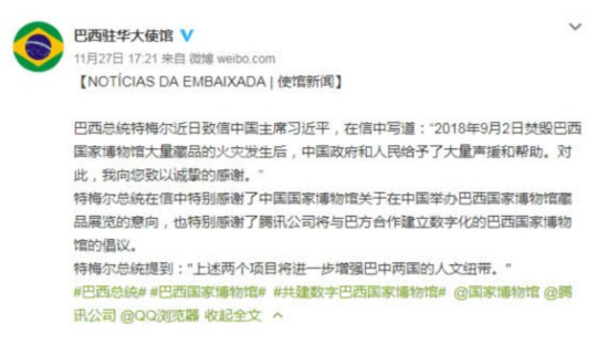 腾讯科技讯 2018年11月27日,巴西驻华大使馆官方微博发布一则新闻,巴西总统对帮助巴西国家博物馆的中国政府、企业和人民表示感谢,原博如下: