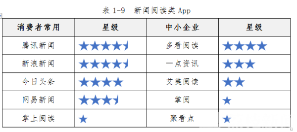 8.新闻阅读类App。10款新闻阅读类App被评为四星或四星半的是腾讯新闻、新浪新闻、今日头条、多看阅读;三星或三星半的是网易新闻、一点资讯;艾美阅读被评为二星;掌阅、聚看点、掌上阅读被评为一星。