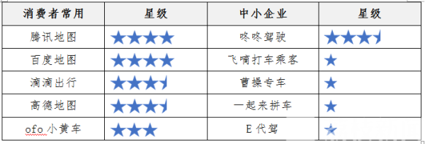 5.出行导航类App。10款出行导航类App被评价为四星的是腾讯地图、百度地图;达到三星或三星半的是滴滴出行、高德地图、咚咚驾驶、ofo小黄车;飞嘀打车乘客、曹操专车、一起来拼车、E代驾被评价为一星。