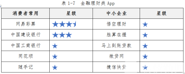 6.金融理财类App。10款金融理财类App被评价为三星或三星半的是网易彩票、中国建设银行;胜算在握、微贷网、中国工商银行、捷信快贷、随手记、同花顺、马上到账贷款、悟空理财被评价为一星。