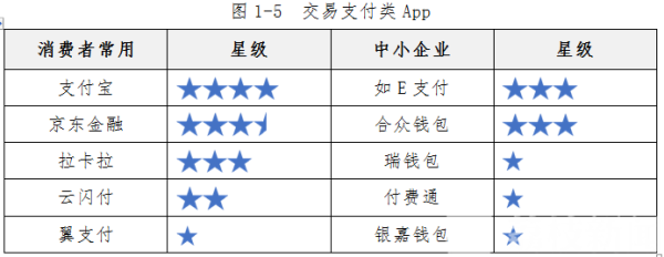 4.交易支付类App。10款交易支付类App被评价为四星的是支付宝;三星或三星半的是京东金融、拉卡拉、如E支付、合众钱包;云闪付被评为二星;翼支付、瑞钱包、付费通、银嘉钱包被评价为一星。