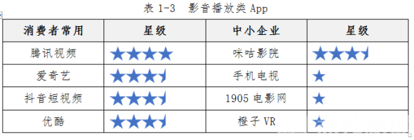 2.影音播放类App。10款影音播放类App被评价为四星的是腾讯视频;三星或三星半的是爱奇艺、优酷、抖音短视频、咪咕影院、快手;橙子VR、手机电视、1905电影网、魔力视频被评价为一星。