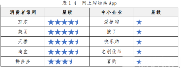 3.网上购物类App。10款网上购物类App被评价为四星半的是京东、美团、天猫、淘宝;三星半的是拼多多;爱抢购、搜了、快乐购、名创优品、喜购被评价为一星。
