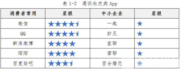 1.社交通讯类App。10款通讯社交类App被评价为四星半或四星的是微信、QQ、新浪微博和陌陌;三星半的是百度贴吧;一起、妙见、宜聊、面聊、百合婚恋被评价为一星。