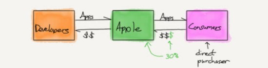 在这个案子中,苹果介于开发者和用户之间。原告解释说:“每次用户购买app(除非它是免费的)时,苹果就向app收取30%的佣金。App向用户收取的价格是app开发者设置的,另外加上苹果自己30%的加价,都是用户每次购买app时直接支付给苹果的。苹果留下这笔钱中的加价部分,剩下的转给app开发者。开发者不会直接把自己的app出售给iPhone用户,也不从iPhone用户那里直接收取任何款项,而iPhone用户是整个分发链中唯一的购买者。”