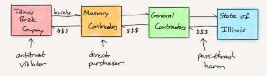 要理解这个案子的复杂性,可以先看看1977年伊利诺伊州砖石公司那个案子的细节。该公司是一家混凝土块生产商,它和一些同行公司被指控串通一气,抬高了混凝土块的价格,这些混凝土块是由砖石承包商购买的,砖石承包商又为总承包商的建筑项目投标,而这些建筑项目最终由伊利诺伊州买单。伊利诺伊州政府提起诉讼,要求赔偿,声称这些公司抬高的混凝土块价格被转嫁到了伊利诺伊州政府头上。