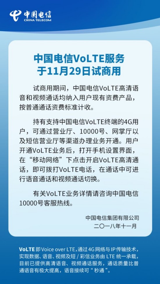 中国电信今日发表公告,备受期待的VoLTE服务于今日(11月29日)开始试商用,资费方面与传统的普通2G/3G网下拨打电话电话没有区别,用户可以通过营业厅、10000号、掌上营业厅和发送短信四种形式开通,当然需要注意的是通话双方的手机必须支持VoLTE,并且在移动网络界面开启该服务,这样在通话的过程中就可以进行视频和语音转换,并且通话中不会导致4G网络掉线。