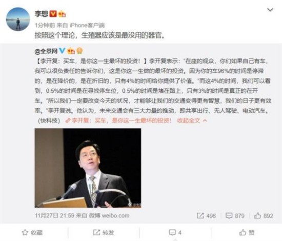 该观点甚至吸引了业内大V的关注。比如汽车之家创始人、车和家CEO李想就表示:“按照这个理论,生殖器应该是最没用的器官。”李想认为,这是在黑自动驾驶、电动汽车、共享出行。