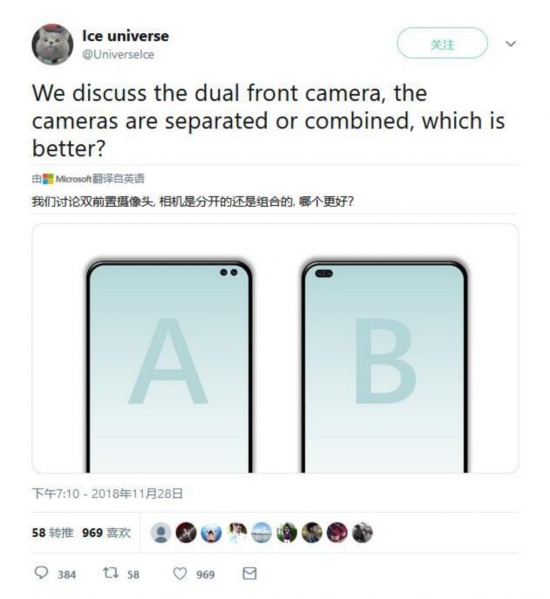国内知名数码博主@i冰宇宙近日发布推文,探讨了机身正面双摄的排列效果,你觉得前置双摄分开打孔好,还是合并打孔好呢?并放出了两种情况的PS渲染图。