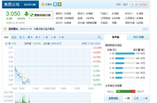 腾讯科技讯 11月30日消息,美图开盘后一路走跌,截至发稿时,美图大跌10%,报3.05港元,创上市以来新低,目前市值只有127亿港元,曾经市值一度逼近1000亿市值。