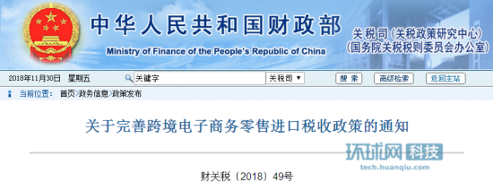 【环球网科技 记者 林迪】11月30日,记者从财政部官网了解到,今日,财政部发布《关于完善跨境电子商务零售进口税收政策的通知》(以下简称“通知”)。