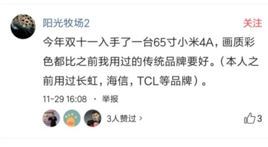 小米电视何以如此强势?超高性价比自然是一个原因,但具有品牌有忠诚度倾向的用户恰恰对价格并不敏感,如同苹果iPhone用户。因此,小米电视销量持续爆发真正的原因更多的是来自产品自身的出色口碑。通过电商和媒体渠道发现,小米电视在产品体验和质量保障方面深受用户的认可和肯定。