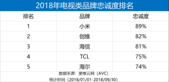 何为品牌忠诚度?答案是口碑。好品牌以用户为中心,通过产品综合体验为用户提供物超所值的价值,消费者自然会喜爱和信赖这样的品牌,无论是自己二次购买还是向亲朋好友推荐仍会选择该品牌,因此,品牌忠诚度一定程度上就是产品口碑。据奥维云网最新统计, 2018年截止9月底,小米电视的品牌忠诚度高达89%,位居行业第一,用户口碑爆表。