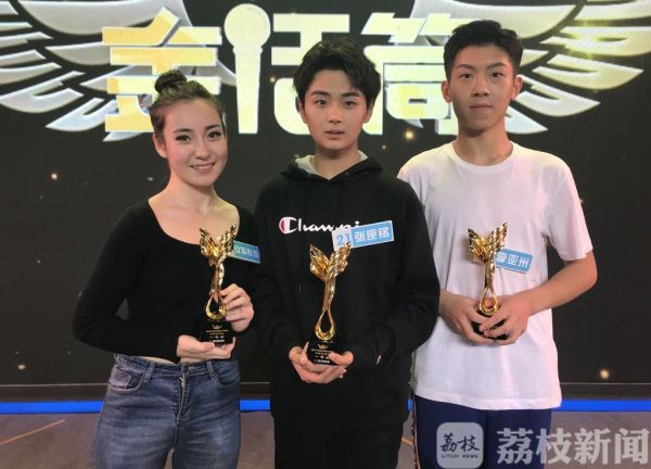 ▲表演专业前三名,左起亚军安妮孜热,冠军张座铭,季军李亚州