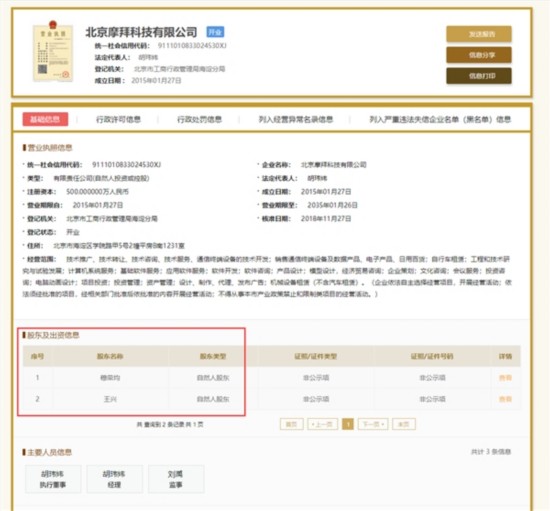 目前,胡玮炜仍然是摩拜法定代表人、执行董事、经理。
