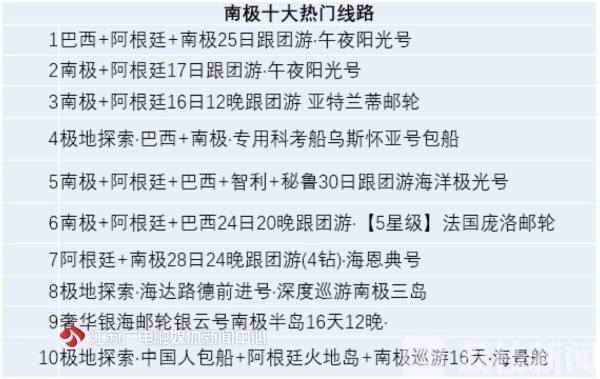 报告还发布了今年最热门的五大邮轮、十大南极线路。热门的有巴西+阿根廷+南极25日跟团游、南极+阿根廷17日游、极地探索巴西+南极等。