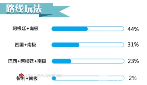 此外,南极线路主要包括“阿根廷+南极”“巴西+阿根廷+南极”“阿根廷+巴西+智利+秘鲁+南极”以及“智利+南极”行程。国家越多,行程天数越长,费用也越贵,一般南极+四国的线路,价格在13万元以上,不过游客选择最多的还是阿根廷+南极线路,占比达到44%。