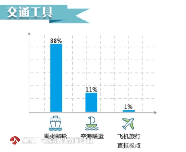 从交通方式来说,全程乘坐邮轮越过德雷克海峡巡游南极,线路价格在5万元到20万元;空海联运,从智利或阿根廷乘坐小型飞机飞往南极半岛,在半岛乘坐邮轮巡游,线路价格在12万元-16万元;最贵的是飞机旅行,直接飞往南极点属于稀缺资源,价格一般在50万元以上。报告统计,目前近9成的中国游客选择乘坐邮轮前往南极。仅有1%中国游客直接飞往南极点。