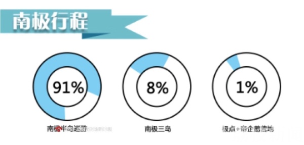 抵达南极后,行程还可以分为“南极半岛巡游”“南极三岛巡游”以及“南极点+帝企鹅营地”行程。其中绝大部分中国游客依然选择南极半岛巡游,占比9成以上。