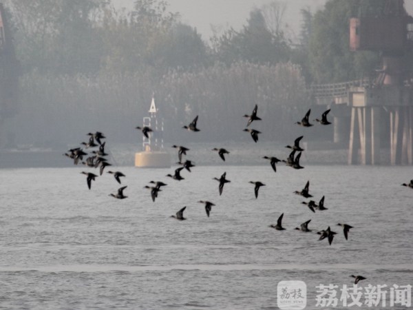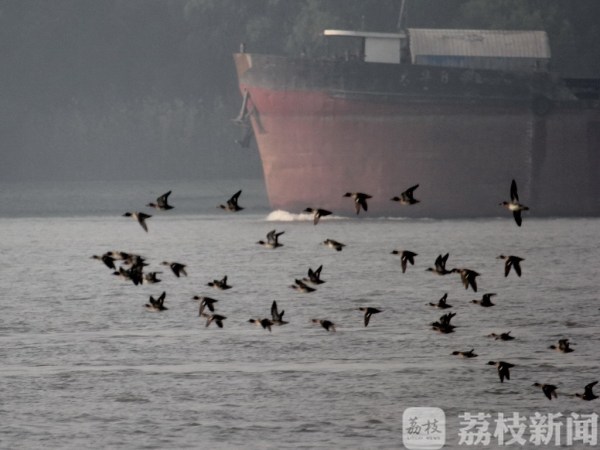 荔枝新闻讯 今天(12月2日)上午,在南京下关的长江上,飞来了成群野鸭,时而空中飞舞,时而又潜入江水中捉鱼,吸引了不少市民驻足观看。