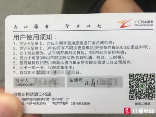 在VIP卡的正面,“三年免费更换机油”的字样尤为醒目,卡背面详细阐述了享受的服务项目,包括凭VIP至尊卡,对应车辆享更换原装进口全合成机油;3年内可享不限次数更换机油(更换条件每5000公里或半年);此卡有效期为:从车辆开票时间算起,3年内到店使用有效;凭此卡可享3年内不限次数保养(限机油、机滤、工时费)。同时,还注明“最终解释权归四川申蓉泓盛汽车贸易有限公司温江分公司所有”,“有限期至2020年8月8日”,也就是说,从购车的2017年8月到2020年8月这3年内,只要姚勇的车达到了5000公里或是半年,满足任何一个条件就可以在4S做免费保养。