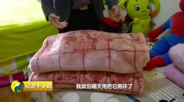 2004年两人结婚时,吉林爸妈给廖良开夫妻寄来一条2000多元的新毛毯。十几年了,廖良开将这张毛毯存放在衣柜里,至今舍不得用。