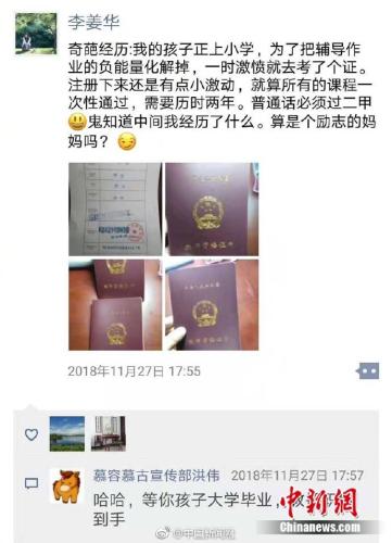 江苏镇江年轻妈妈李姜华发朋友圈称,陪娃写作业自己顺便考了教师资格证。李姜华表示,随着女儿长大,辅导的要求在提高,自己的烦恼也在增多。为了使自己平静下来,也为了给女儿一个励志追求的榜样,她自学考证。