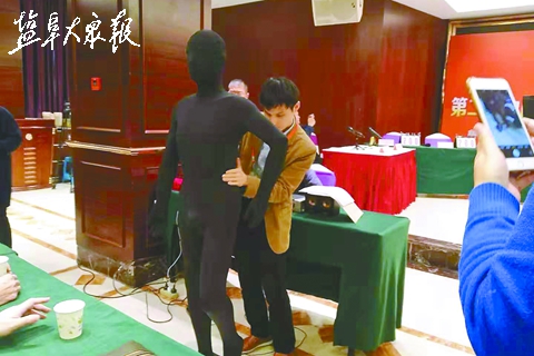 △王冬在比赛现场向评委演示人体穴位。(照片由受访者提供)