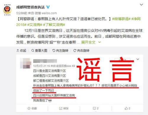 成都网警称,12月1日是世界艾滋病日,这天旨在提高公众对HIV病毒引起的艾滋病在全球传播的意识。但是没想到,涉艾谣言也应运而生。2日,成都网警在网络巡查中发现,新浪微博网民“超**”称“走在春熙路上有人拿病毒携带的针管扎你?感觉只是跟不小心被尖锐物体刮了一下而已。”还表示自己不敢出门了。