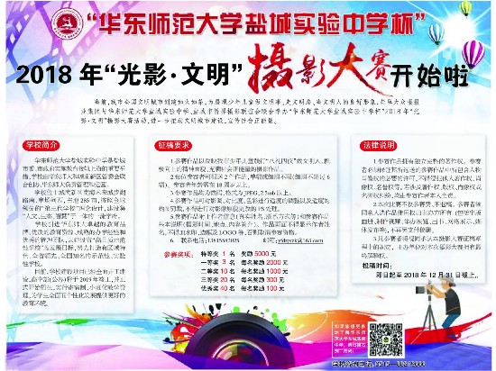 当前,盐城市全国文明城市创建如火如荼,为展现少年儿童做文明事、走文明路、当文明人的良好形象,盐阜大众报报业集团与华东师范大学盐城实验中学、盐城市侨界摄影联谊会联合举办“华东师范大学盐城实验中学杯”2018年“光影·文明”摄影大赛活动,进一步推动文明城市建设,宣传社会正能量。