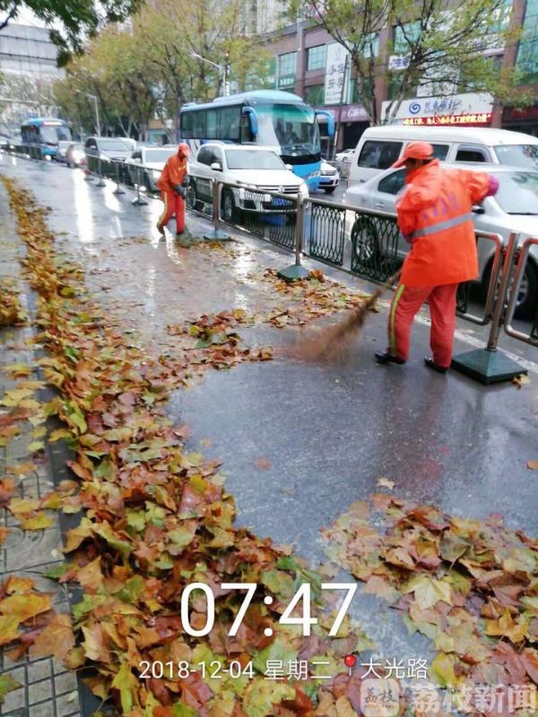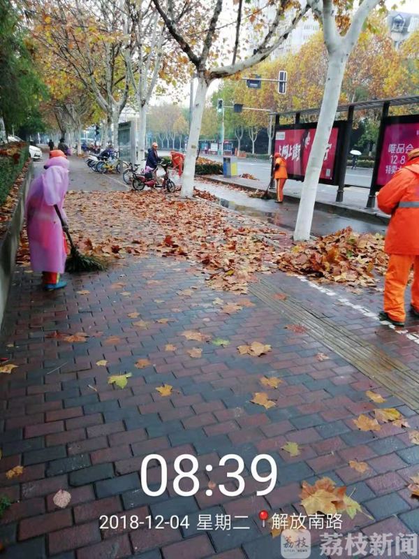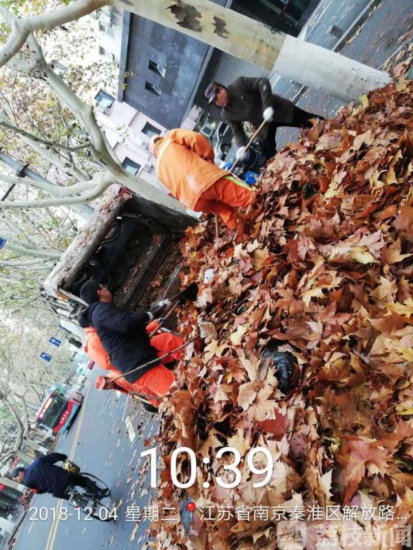 今年秋冬气温下降缓慢,落叶时间延长,加上昨晚一场降雨天气影响,落叶铺满道路。为保持市容环境整洁,秦淮区环卫所启动了冬季应急预案,统一部署,积极应对落叶现象,增加保洁频率。环卫工人通过即扫即清的方式,把落叶清扫到一起,用三轮车、塑料袋等清运工具及时运走。