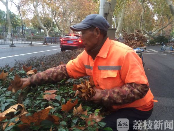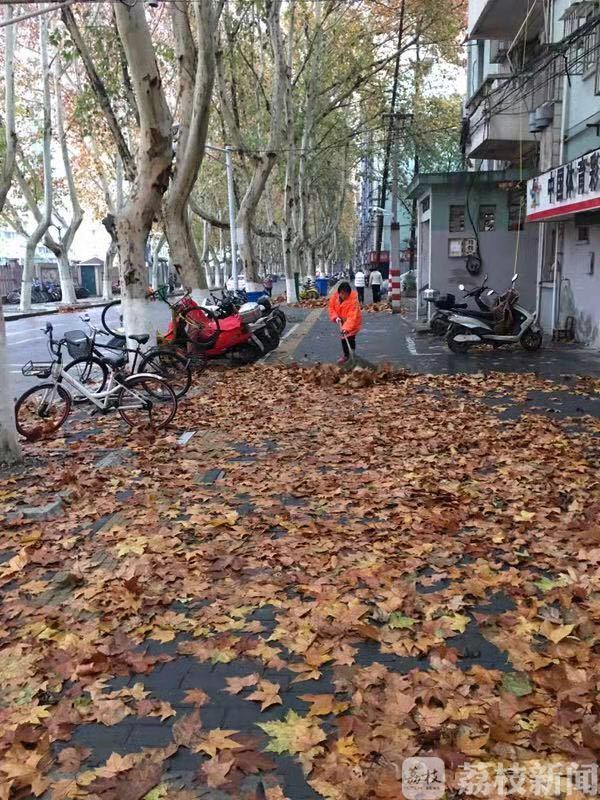由于路面落叶多、厚、面积大,清扫难度大,秦淮区的环卫工人们“组团”清扫,5人一排横着向前推扫。