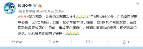 中新网12月5日电 深圳市公安局交警支队官方微博今日发布消息称,12月5日12时09分,在龙岗区坂田中心围一区5号1楼旁,发生一起小车倒车时,撞倒一位1岁10个月的女孩,经送医院抢救无效死亡。