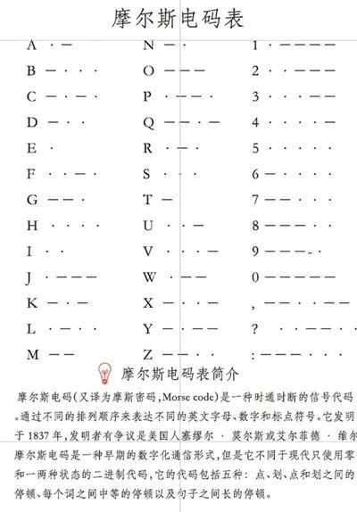 摩尔斯电码发明于1837年,以时通时断的信号为代码,所以敲击的声音、闪灭的灯光都可以用来传递信息。电影《风声》中周迅扮演的女主角就在衣服上缝了摩尔斯电码,将消息传出去。动漫《名侦探柯南》中也用这种方法传递消息。