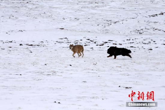 近日,青海玉树籍摄影爱好者才丁在杂多县查旦乡境内捕捉到一组“獒狼大战”照片,照片中一只藏獒对踏入其“领地”范围内的狼各种围追堵截,直至驱赶“出境”。