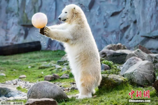 你知道北极熊的生日礼物是什么?是一个小球。当地时间12月4日,位于德国北威州盖尔森基兴市动物园北极熊Nanook过第一个生日,在园内收礼物开心玩耍。