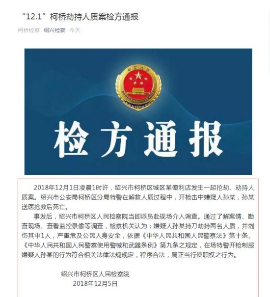 检方通报称,2018年12月1日凌晨1时许,绍兴市柯桥区城区某便利店发生一起抢劫、劫持人质案。绍兴市公安局柯桥区分局特警在解救人质过程中,开枪击中嫌疑人孙某,孙某送医抢救后死亡。