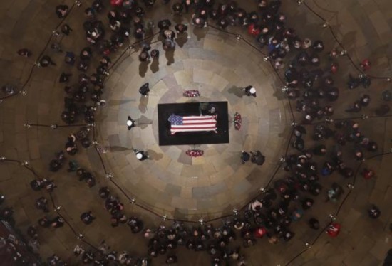 11月30日,老布什在德克萨斯州休斯顿的家中辞世,享年94岁。12月3日下午5时,老布什的遗体在军人护卫下进入了美国国会山的圆顶大厅中,供民众在葬礼举行之前瞻仰。