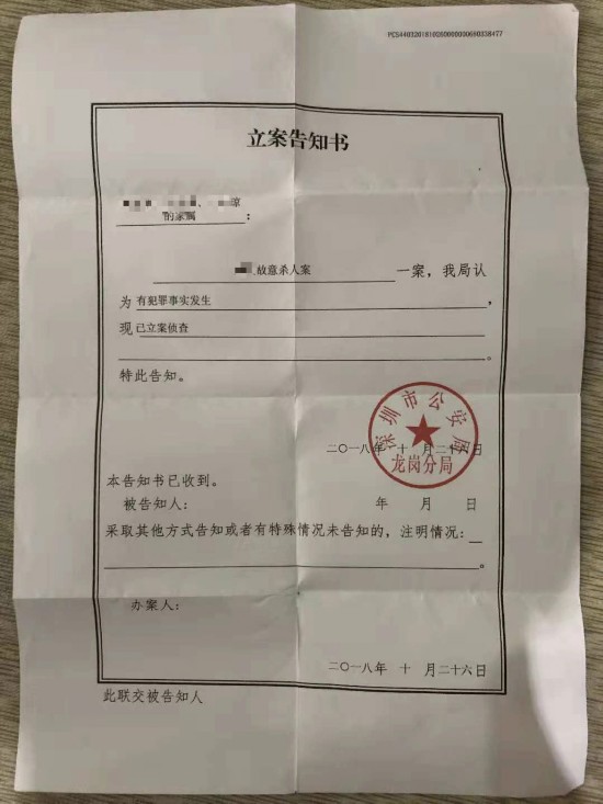 王直家属收到的刘全故意杀人案立案告知书。 受访者供图