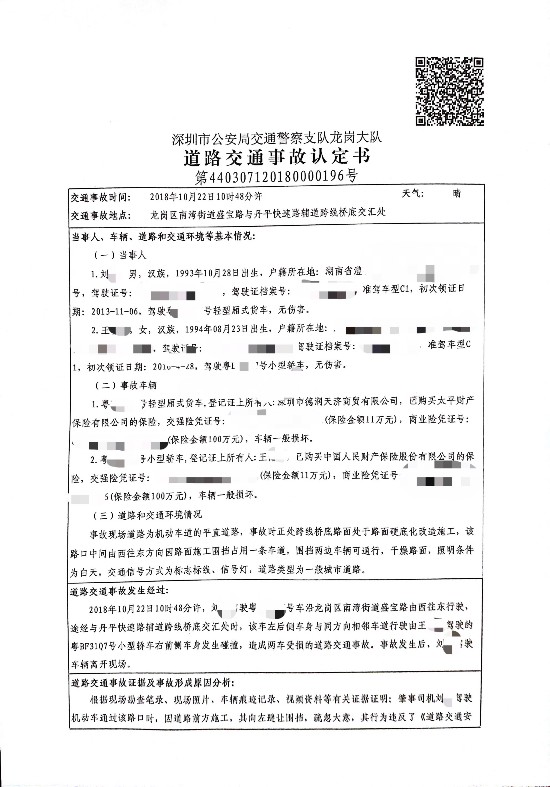 深圳警方介绍,10月26日14时许,双方先后到达南湾交警中队,再次进行协商。值班民警在一楼办公室了解事故情况后,认为刘全驾驶车辆通过事故路口时,疏忽大意,未察觉左侧相邻车道机动车,是造成事故发生的直接原因,无证据证明王雪有过错,刘全应承担全责。事故发生后,刘全驾驶车辆继续往前正常行驶、离开现场(过程中没有急刹车和急加速的行为),接到通知后积极配合,及时赶到中队接受处理,不能认定为肇事逃逸。如自行协商不成,将出具《交通事故责任认定书》,可以报保险处理。