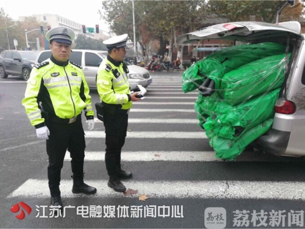 记者发现,王峻鹏的帽子和裤子有不少难以清洗的泥点,这是当天他被车拖拽留下的。12月1日上午10点半,南京交警执勤三中队民警在模范中路中山北路路口开展整治工作时,发现一辆银色面包车涉嫌非法改装,遂依法将其拦下。民警发现该面包车车内座椅已被全部拆除,塞满了一包包的建材,导致后车门无法关上,一直打开着,车内物品有随时滑落的危险。