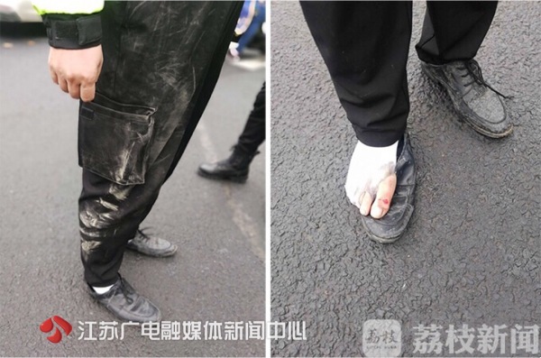 日前,一辆面包车因涉嫌非法改装被依法拦下查处。面包车司机为逃避处罚,猛踩油门加速逃离现场,将一旁的警辅带倒,拖行五十多米后被拦截,导致警辅皮鞋警裤磨破,身上多处受伤。今天,记者在南京中山北路与模范中路交叉口,见到了带伤执勤的90后警辅王峻鹏。